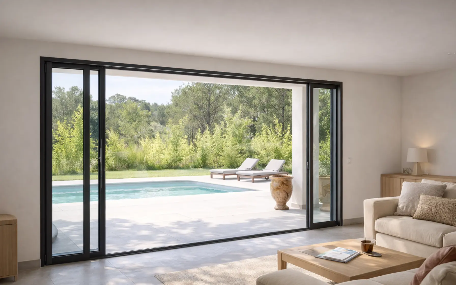 Le vantail disparaît entièrement dans le mur à l’ouverture. Le passage est totalement libre, sans montant visible. C’est la solution haut de gamme pour effacer la frontière entre intérieur et extérieur — idéale pour les projets contemporains.